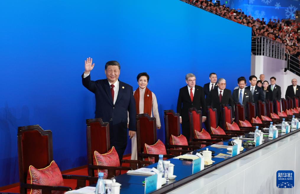 19时58分,在《和平——命运共同体》的乐曲声中,习近平和夫人彭丽媛,同国际奥委会主席巴赫、亚奥理事会第一副主席霍震霆等步入主席台,向观众挥手致意。全场响起长时间的热烈掌声。